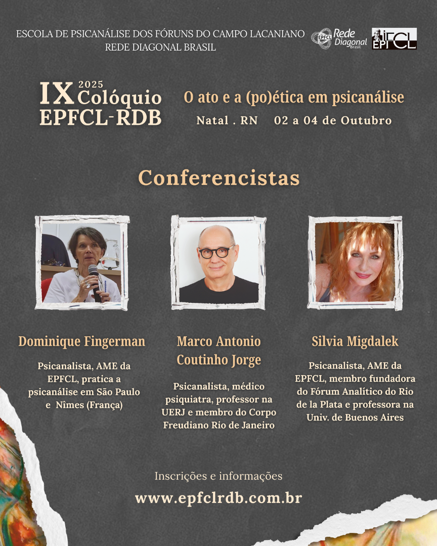 Por fim, destaquemos Lacan ao dizer da “ética que se inaugura pelo ato analítico a lógica manda, isso é certo, por nela encontrarmos seus paradoxos” (Lacan, 1969/2003, p.376) e dessa forma convidamos com muito entusiasmo para o lX Colóquio da EPFCL- RDB.