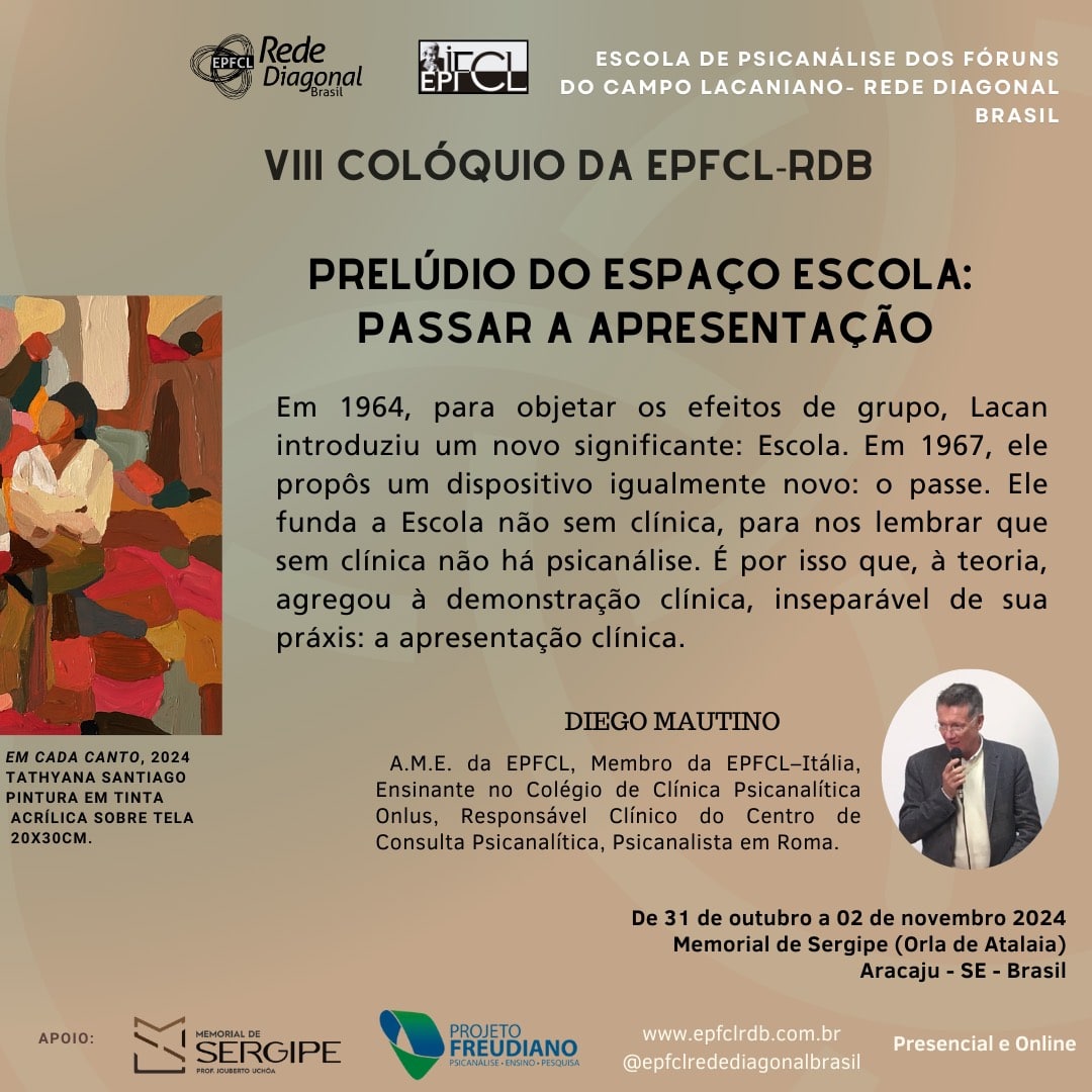 DIEGO MAUTINO – A.M.E. da EPFCL, Membro da EPFCL–Itália, Ensinante no Colégio de Clínica Psicanalítica Onlus, Responsável Clínico do Centro de Consulta Psicanalítica, Psicanalista em Roma.